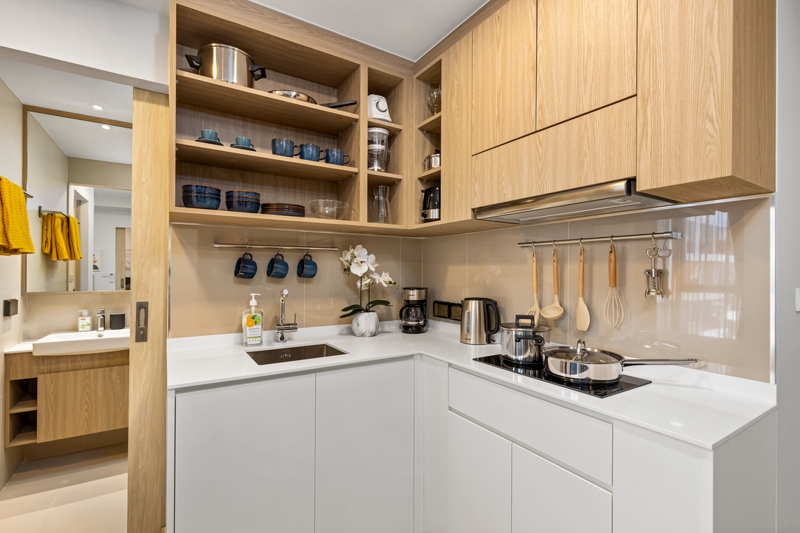 - Полный комплект посуды, в том числе для приготовления пищи, а также кухонных аксессуаров.